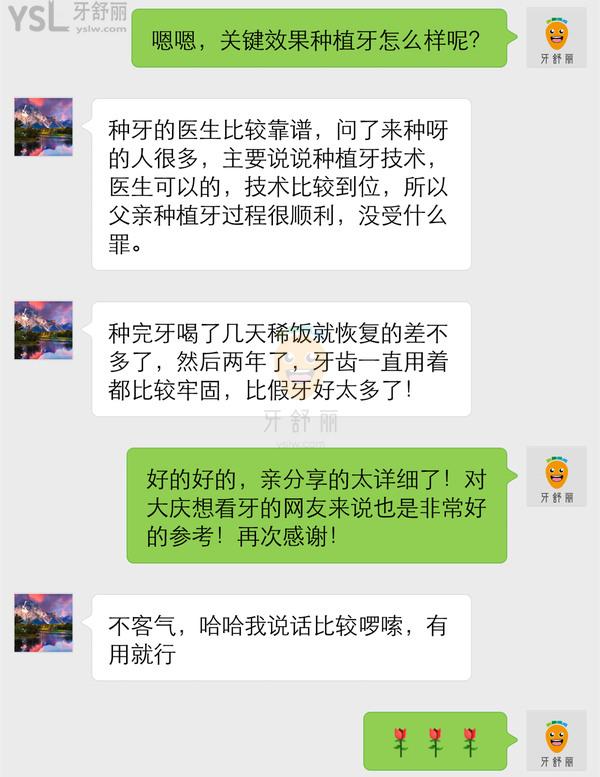 醫(yī)生的技術(shù)也確實到位,婆婆說全程感覺也不痛,還沒反應過來種牙就結(jié)束了,體驗很棒。不得不說種植牙確實是比假牙好太多了!牙齒一直用著特別好,挺結(jié)實的,不像以前假牙打個噴嚏有時候都掉出來了,沒有對比就沒有傷害啊!”